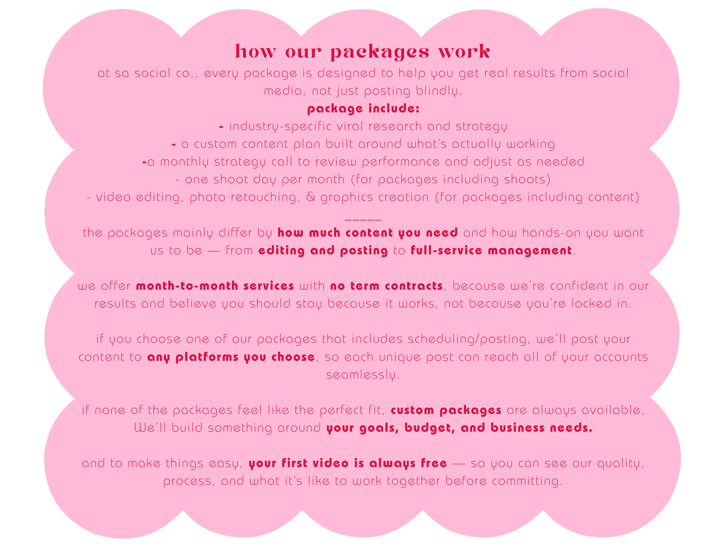 Not sure which package fits your business? Let’s chat about your goals and build the perfect plan for your brand!